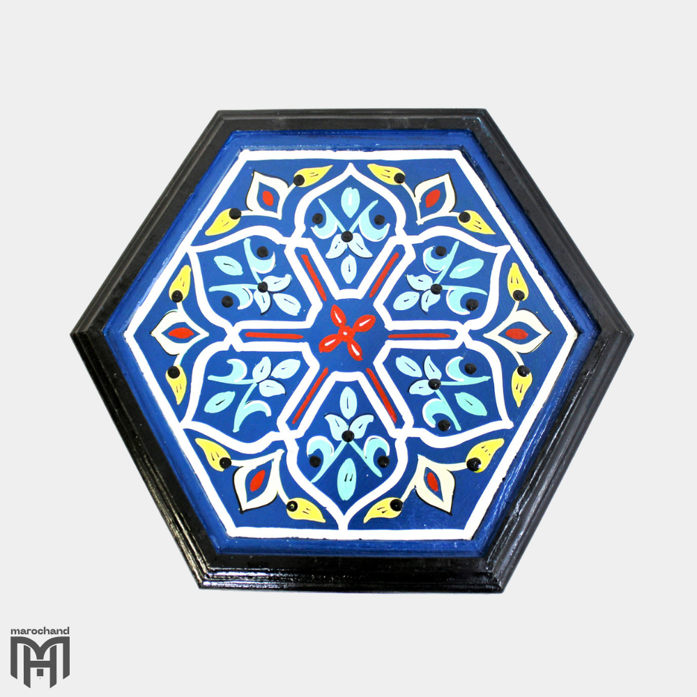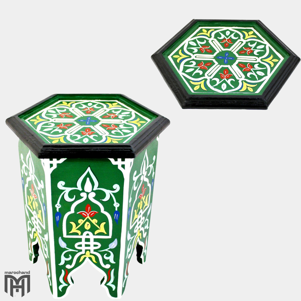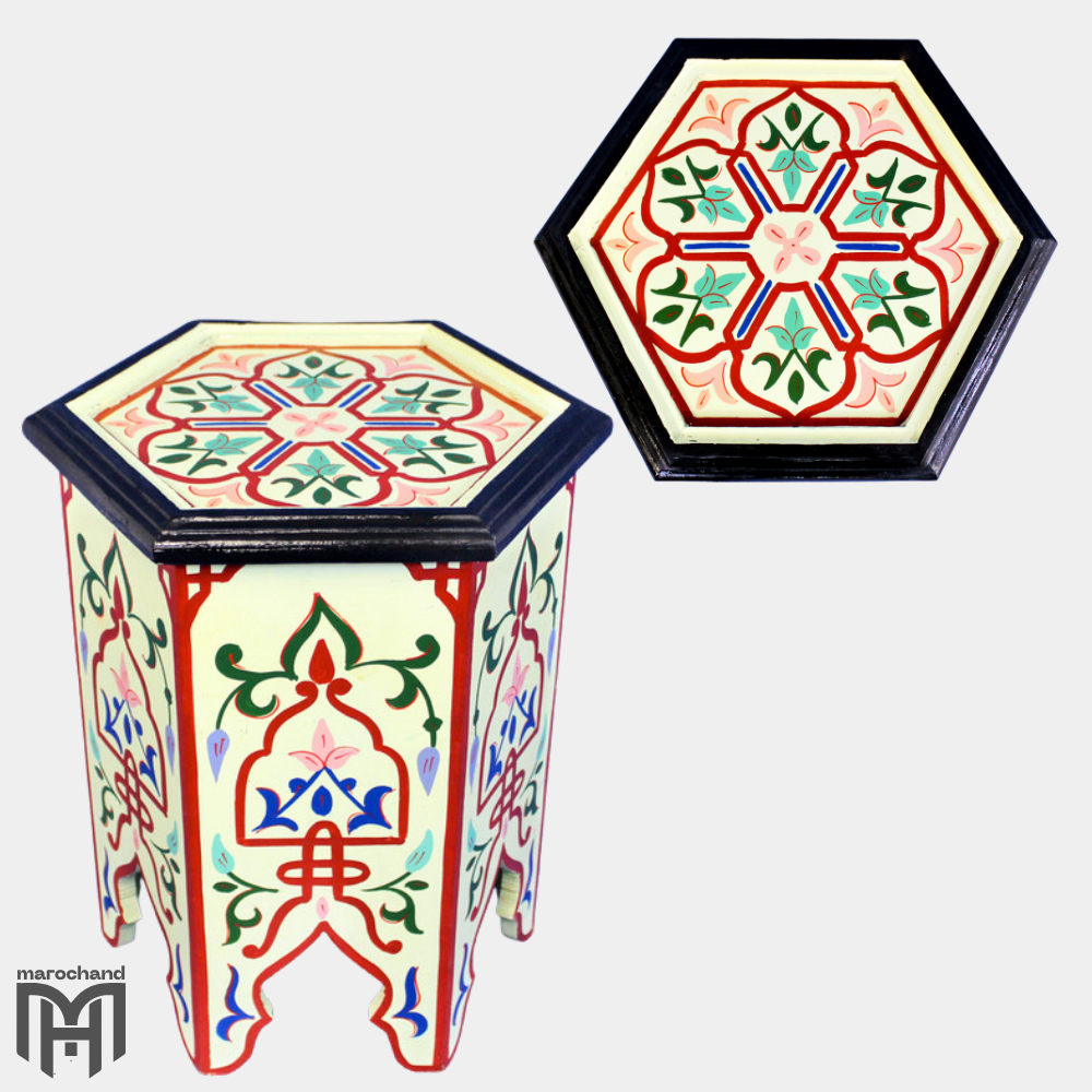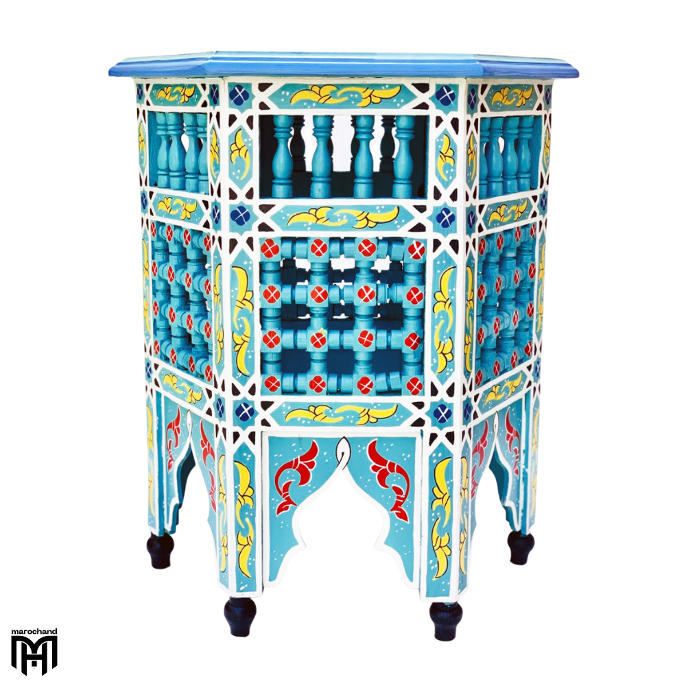 Every inch of this table is hand-painted by Moroccan artisans using techniques passed down through generations. The brilliant blue background contrasts beautifully with bright reds, yellows, and aqua tones, creating a dynamic centerpiece. The symmetrical pattern on the hexagonal top provides visual balance, while the floral side panels enhance its decorative appeal.
