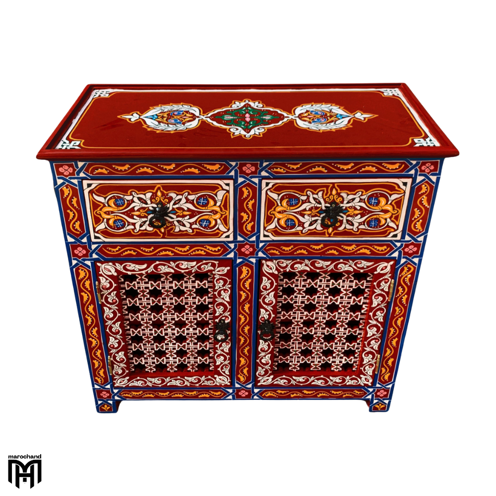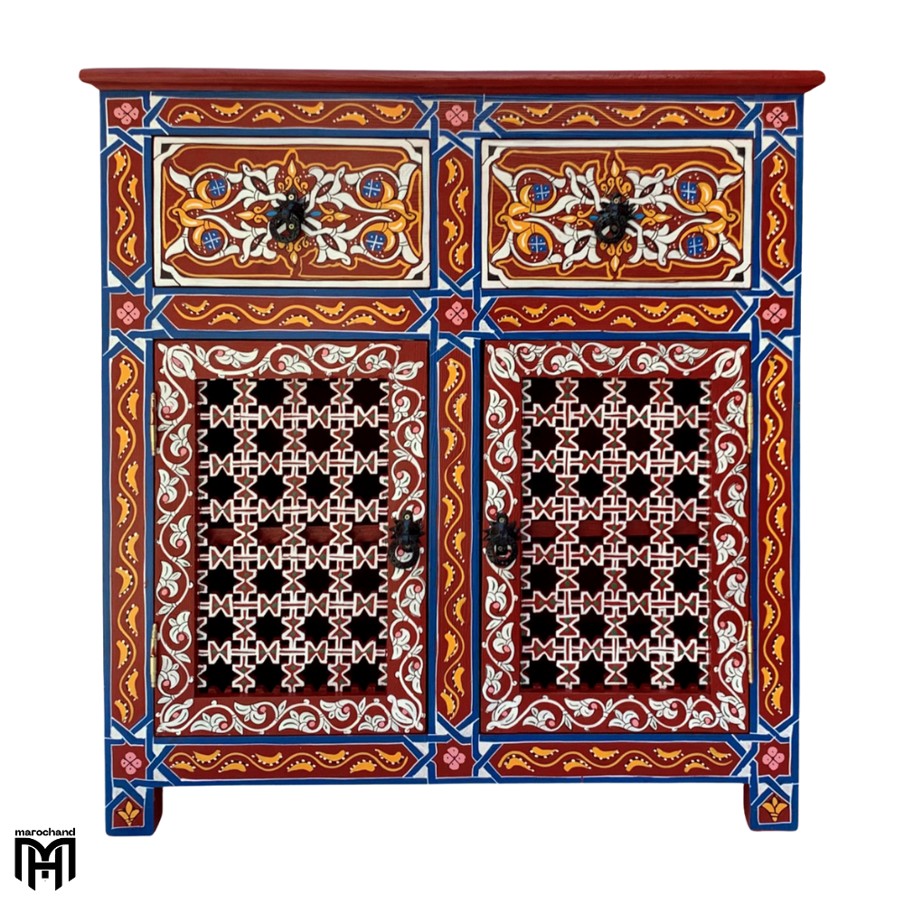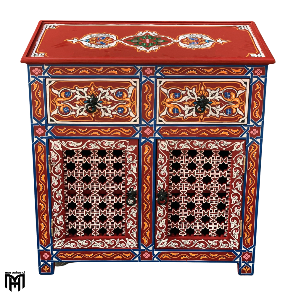 Discover the beauty of authentic Moroccan craftsmanship with this exquisite hand-painted chest of drawers. This stunning piece serves as both a practical chest of drawers for bedroom and a work of art, featuring traditional designs that bring vibrant color and character to any space.