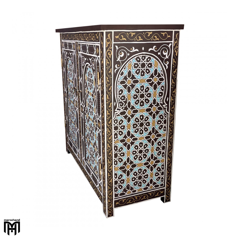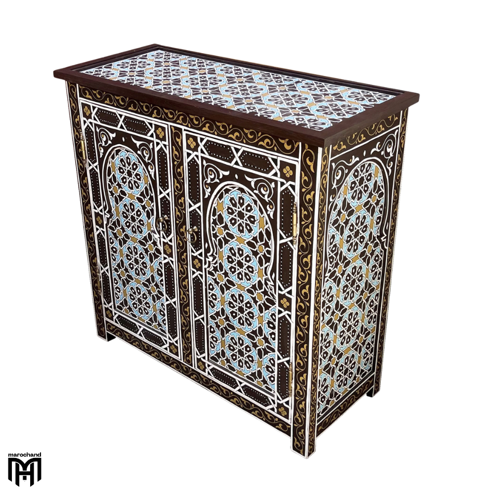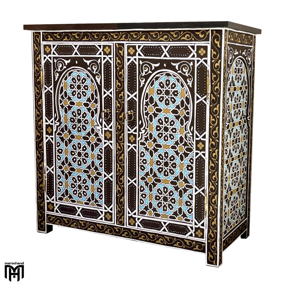 Introducing the SANSIBAR collection, featuring an exquisite Moroccan Oriental hand-painted chest of drawers that blends Eastern influences with traditional Moroccan artistry. This stunning piece serves as both a functional chest of drawers for bedroom organization and a work of art, showcasing intricate hand-painted designs that reflect the rich cultural heritage of Oriental and Moroccan craftsmanship.