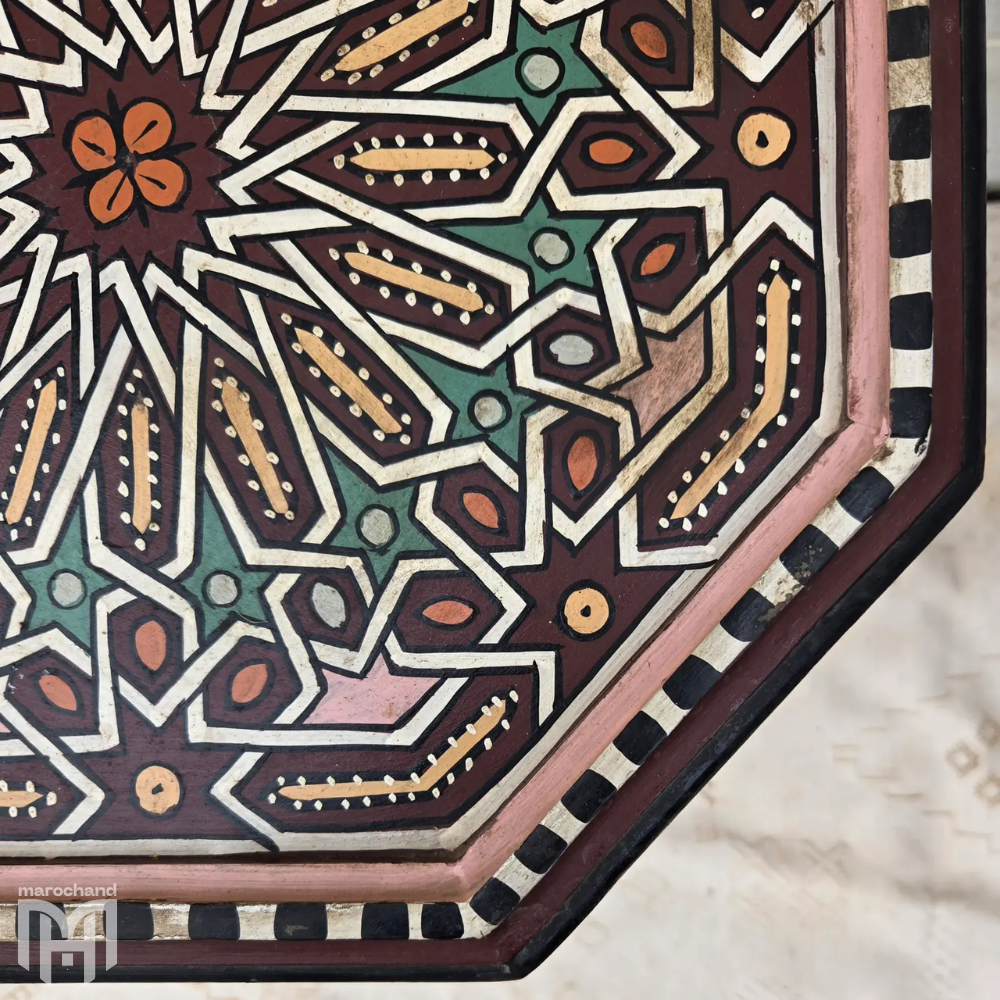 Introduce timeless Moroccan craftsmanship into your living space with this exquisite Moroccan Hand-Painted Octagonal Accent Table in a stunning maroon Zouak design. This side table is more than just furniture — it’s an artistic expression of Moroccan culture, hand-carved and hand-painted with intricate Moorish patterns passed down through generations.