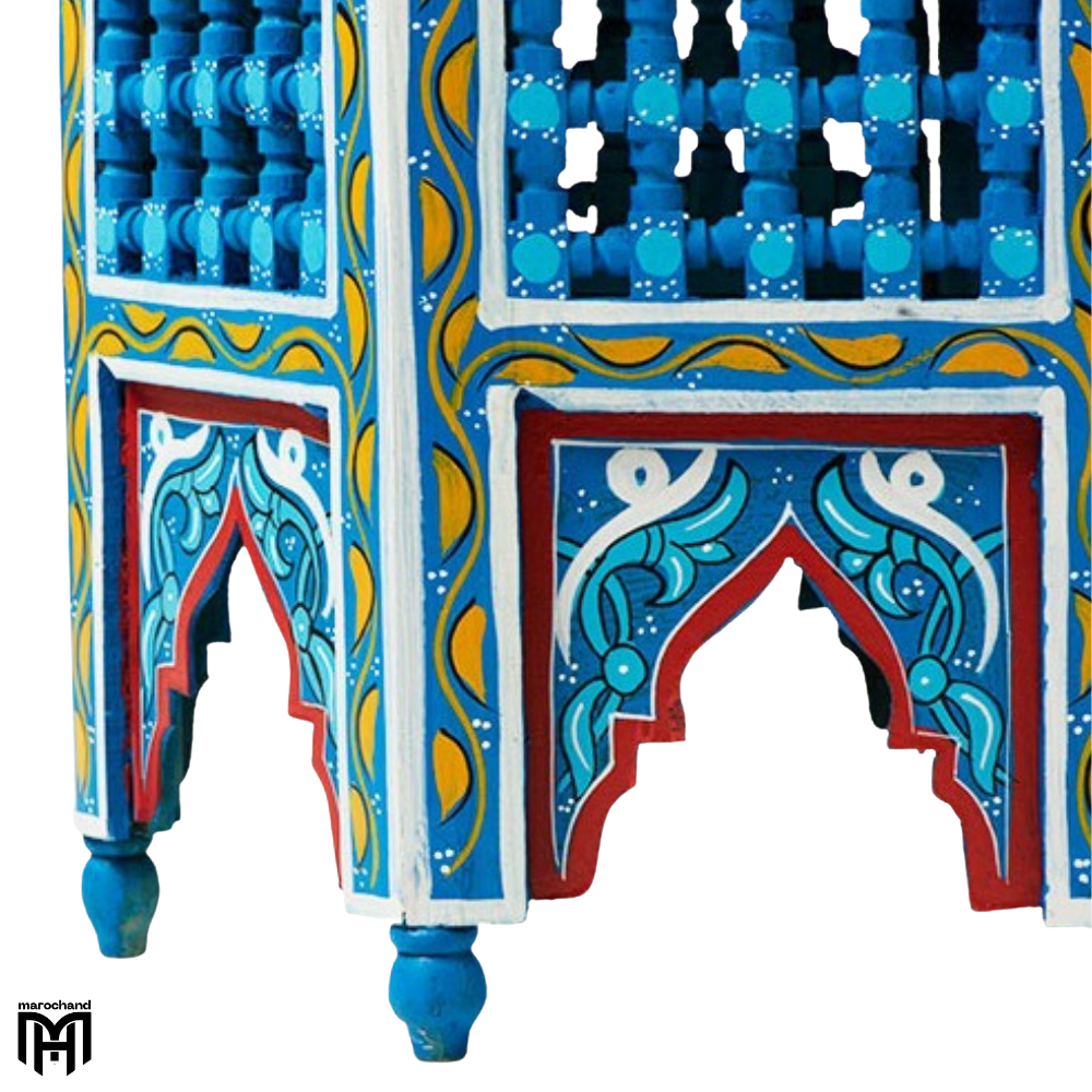 Bring a vibrant touch of artisan craftsmanship to your home with the Moroccan Blue Hexagonal Natural Wood Table. This eye-catching piece, finished in a stunning Moroccan blue, serves as a versatile centerpiece for any room. Use it as a distinctive wood coffee table or a wooden coffee table to anchor your living space. Its unique hexagonal shape provides a modern twist on the traditional round coffee table, making it a perfect side table, entryway table, or bedside table.