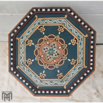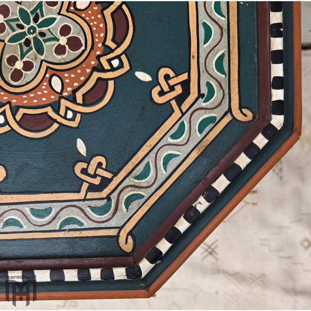 The bold hexagonal silhouette is adorned with intricate geometric and floral patterns, painted in soothing tones of teal, burnt orange, olive green, and ivory. This combination makes the table a conversation piece that complements both modern and traditional interiors.