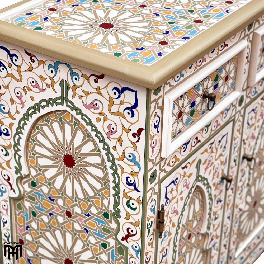 Discover the TALAYA collection, an exquisite Moroccan colorful oriental chest of drawers showcasing intricate hand-painted designs that blend traditional artistry with functional storage. This versatile chest of drawers serves as both a practical bedroom chest of drawers and an artistic centerpiece, bringing authentic Moroccan charm to your home.