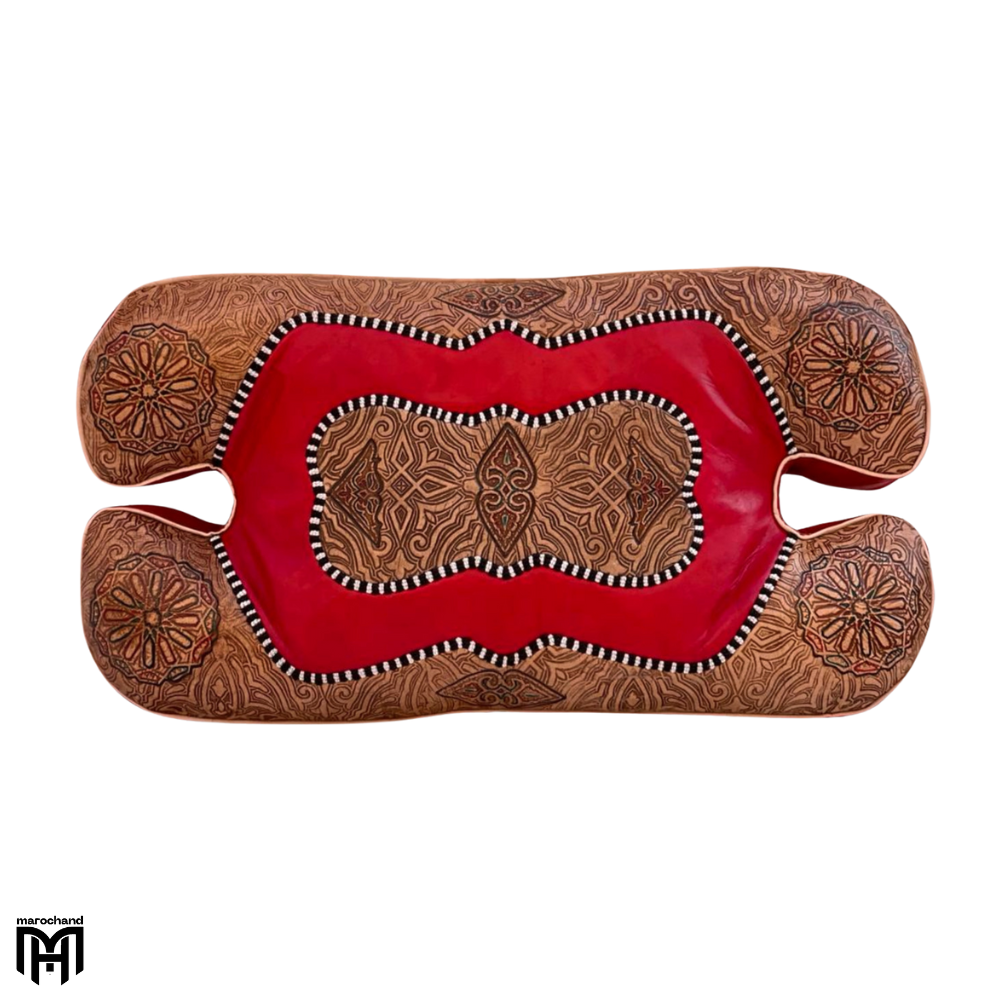 Introducing the RABATI Moroccan Oriental Stool in vibrant red with traditional Mtaraz detailing, a stunning leather pouf that celebrates the rich heritage of Moroccan craftsmanship with bold Oriental influences. This exceptional piece from the RABATI collection features brilliant red leather adorned with authentic Mtaraz patterns—a traditional Moroccan design technique characterized by intricate stitching and geometric precision. Creating a dramatic leather love seat that serves as both functional furniture and cultural art piece, this stool is perfect as an eye-catching ottoman pouf for your living space, a durable outdoor pouf for patio arrangements, or a safe baby pouf for children’s areas.