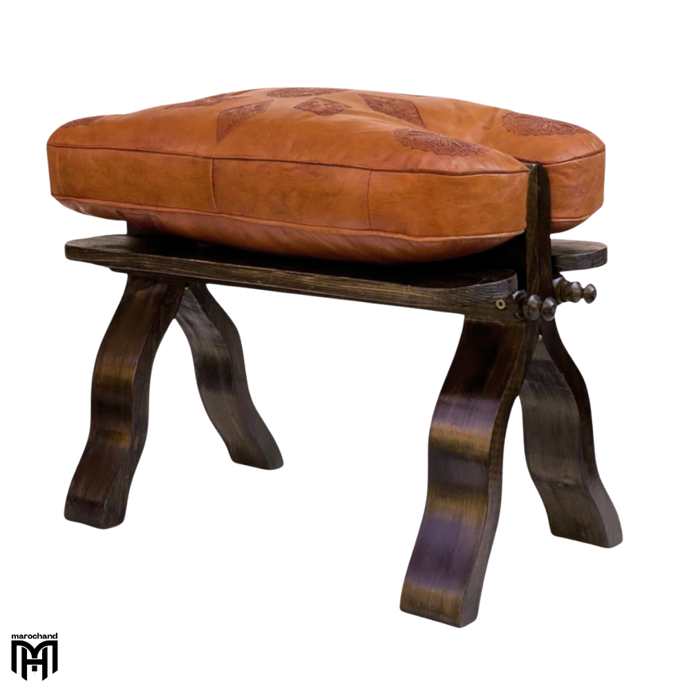 Moroccan RABATI Oriental Stool | Cognac Leather Poufs Ottoman