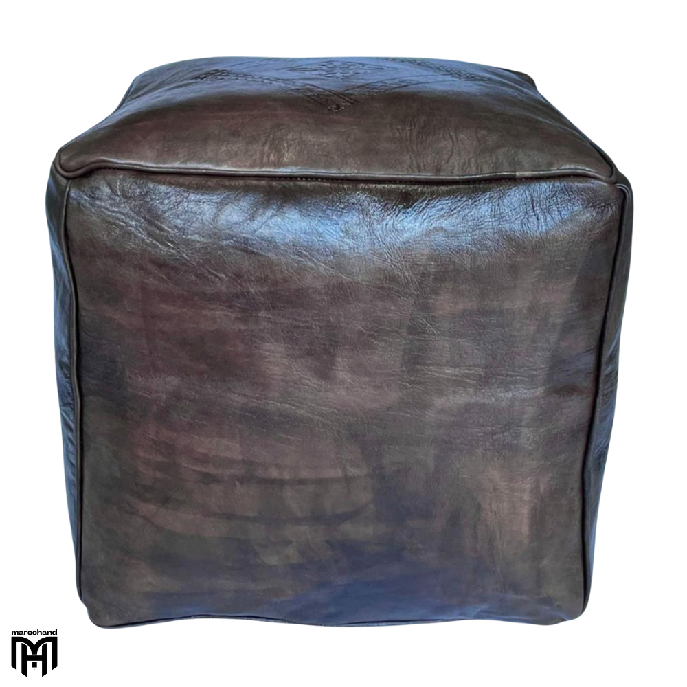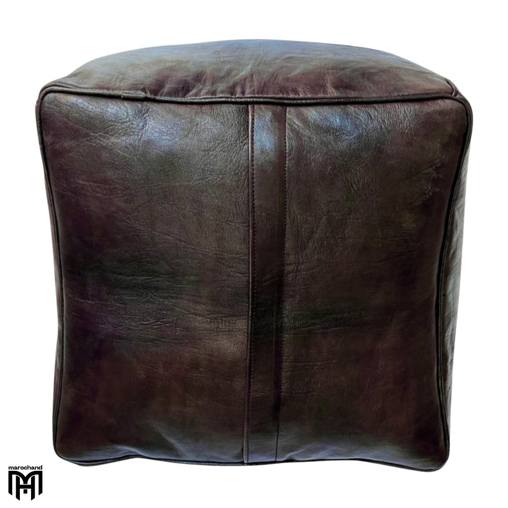 Discover the sophisticated elegance of this Moroccan Square Leather Seat Cushion in rich dark brown, a versatile piece that combines clean geometric lines with traditional craftsmanship. This expertly crafted square leather pouf features deep brown leather that develops a beautiful patina over time, creating a versatile leather love seat that complements both modern and traditional interiors. Perfect as a structured ottoman pouf for your living space, a durable outdoor pouf for patio arrangements, or a safe baby pouf for children’s areas.