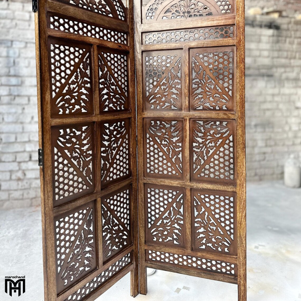 Experience the perfect harmony of retro sophistication and ethnic charm with the Moroccan Mid Century Wooden Folding Room Divider. This handmade partition screen masterfully combines the clean, organic lines of mid-century modern design with subtle Moroccan influences, creating a versatile room division solution that complements both contemporary and traditional interiors. The elegant wooden construction features refined details that echo mid-century aesthetics while maintaining the warmth and artistry of Moroccan craftsmanship. Discover inspiring room divider ideas with this exquisite piece that balances form and function – use it as a substantial alternative to lightweight room divider curtains, a stylish folding room divider for modern living spaces, or a decorative folding screen room divider that adds architectural interest to any room.