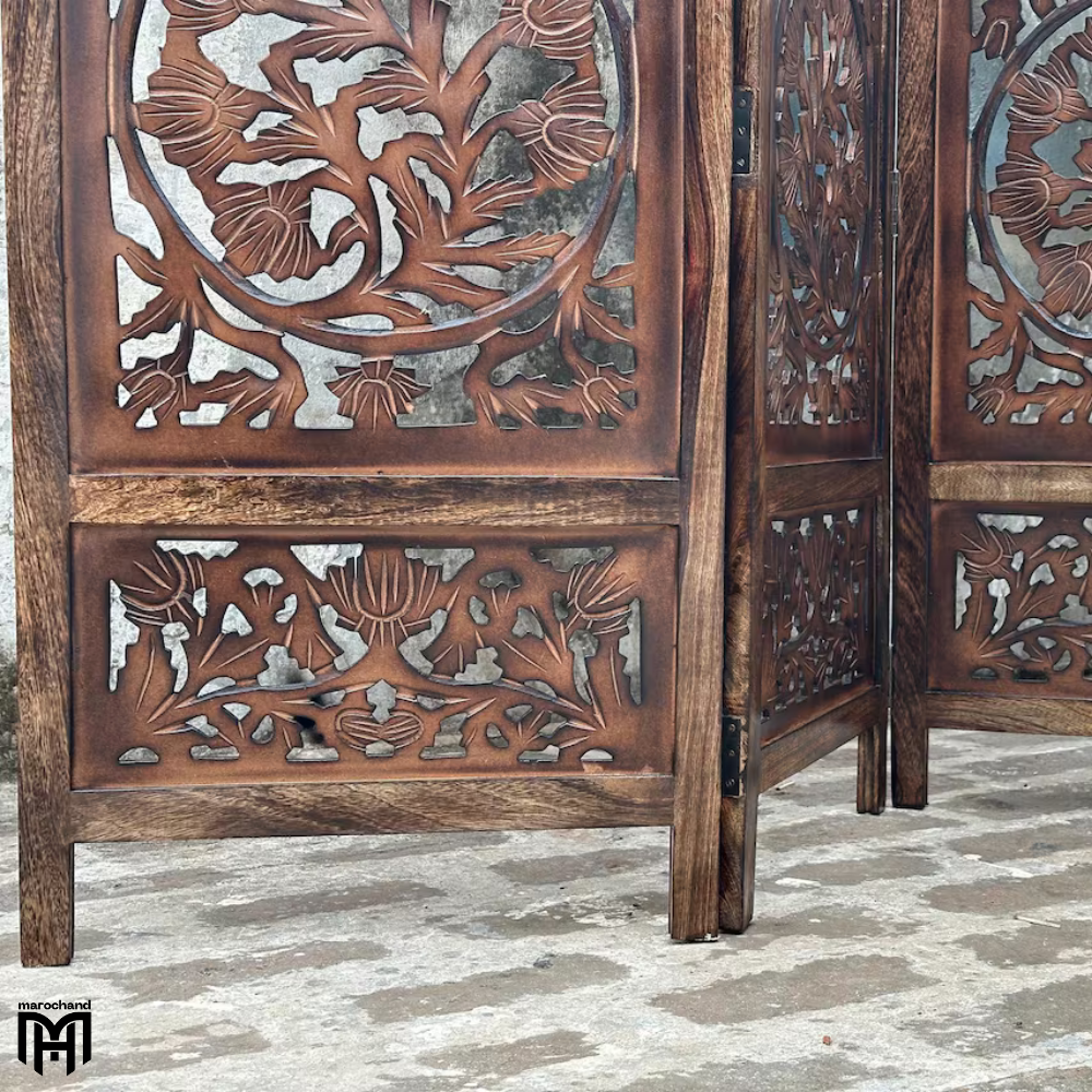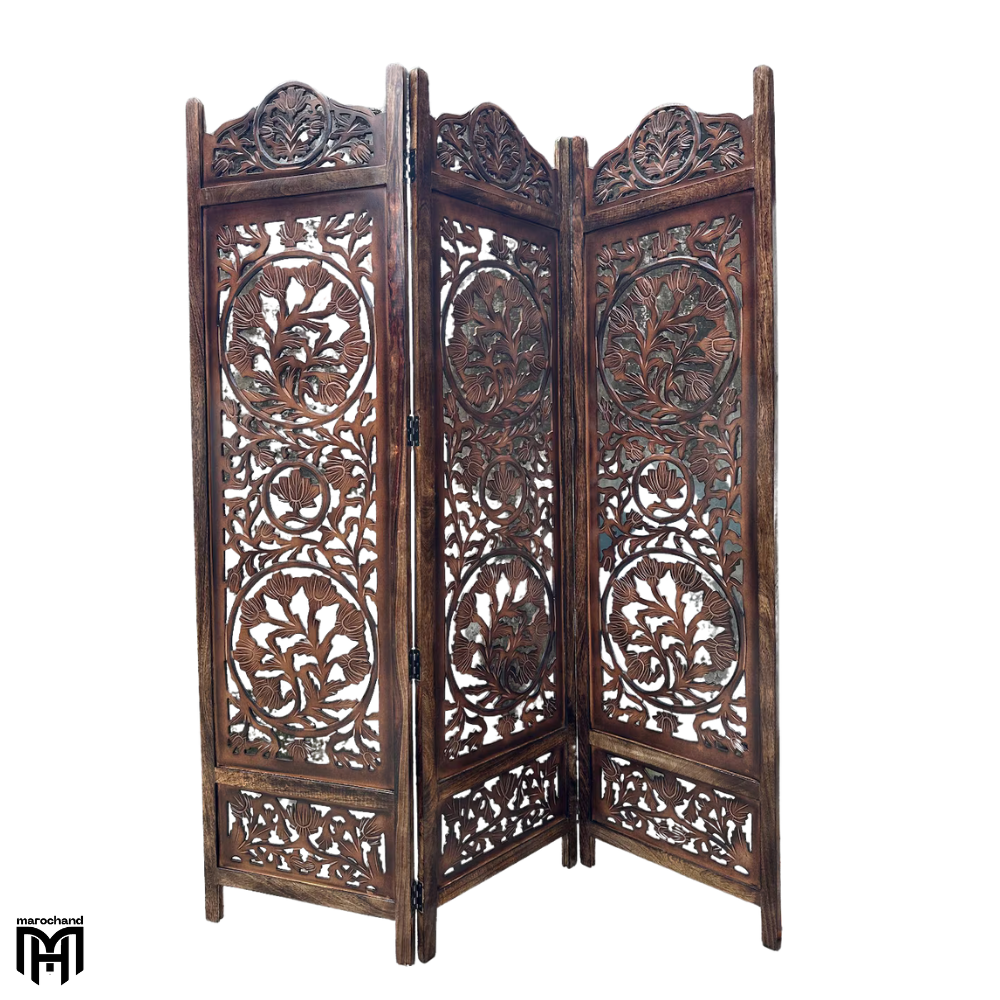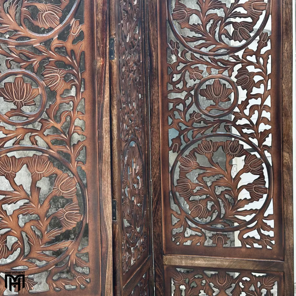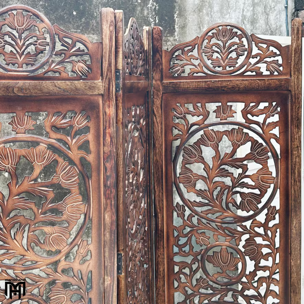 Moroccan Handmade Lotus Wood Room Divider | Brown Folding Partition Screen