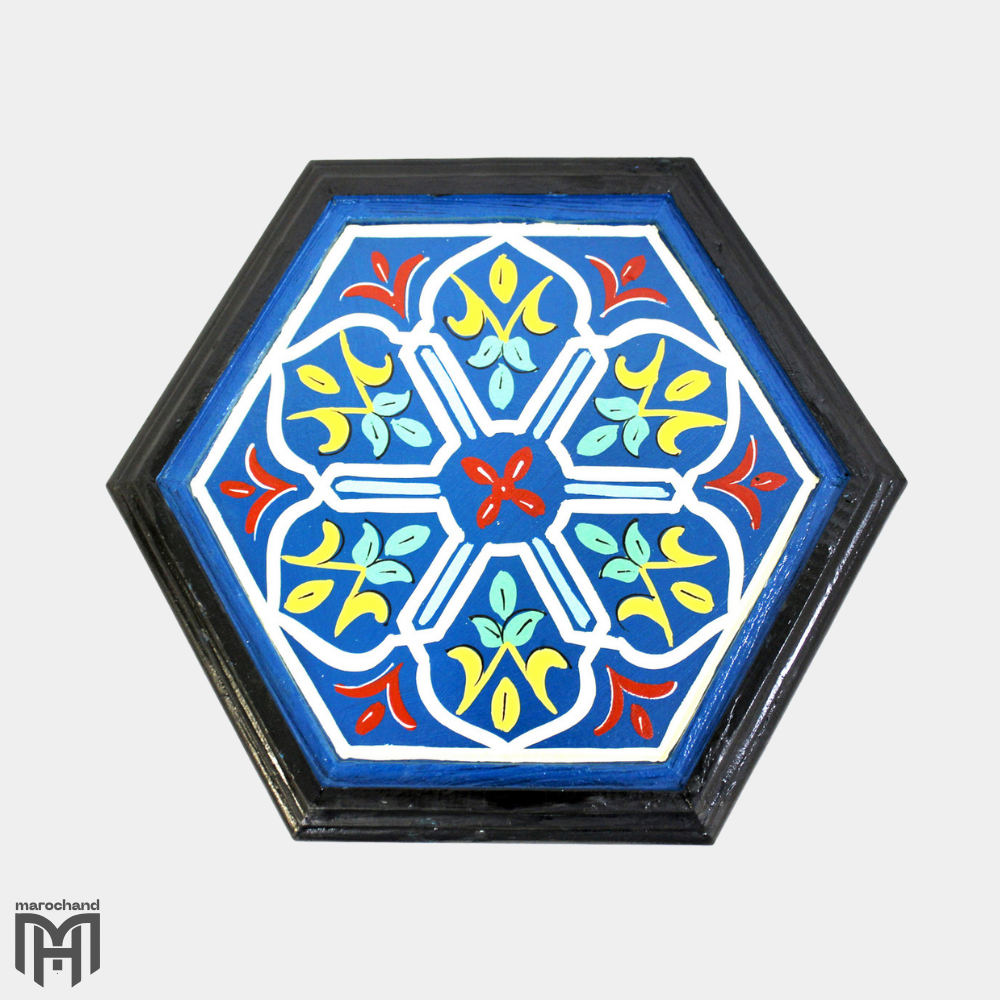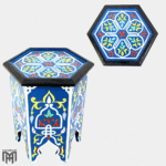 This Royal Blue Moroccan Hexagonal Side Table showcases traditional craftsmanship in a bold colorway. The hand-painted floral and geometric detailing captures the rich essence of Moroccan design. With a hexagonal tabletop and carved legs, this piece functions as both furniture and art. Made from sturdy solid wood and painted in royal blue with vibrant yellow, red, and green accents, it complements interiors with character and culture.