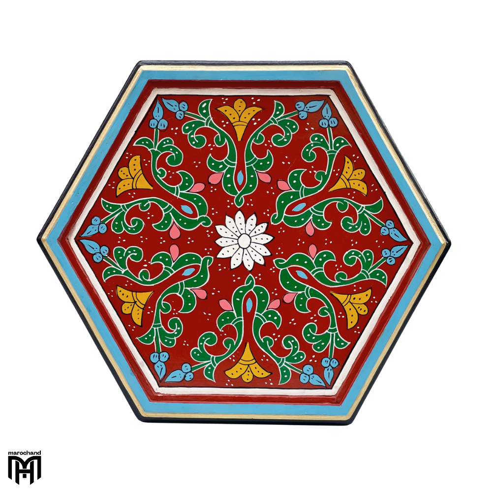 This multifunctional piece serves ideally as both a table and side table, adapting to your space as a small side table for compact areas or an intimate wood dining table for casual meals. The artistic surface provides a stunning backdrop for table decor and creates an elegant base for table lamps. Whether used as a welcoming entryway table, a ceremonial tea table, an alternative to conventional round coffee table designs, or a unique dining room table accent, the NIHAL table embodies the spirit of Moroccan craftsmanship with its exceptional hand-painted details and timeless appeal.