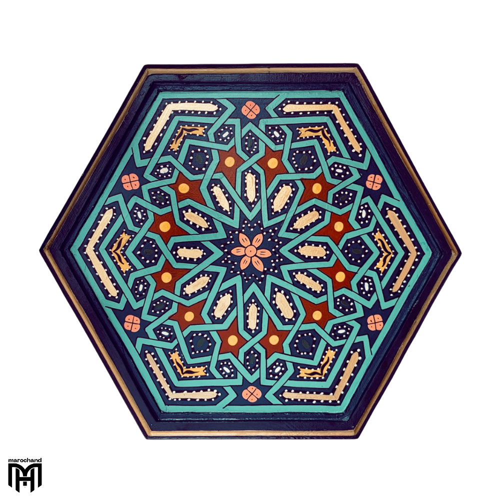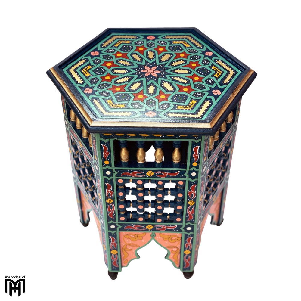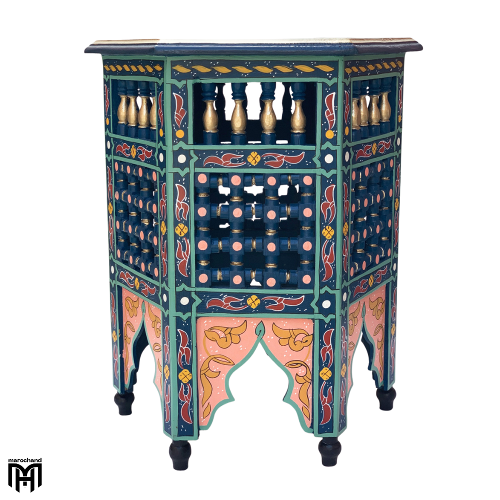 Use this magnificent table as a regal entryway table that makes a bold first impression, or as a luxurious alternative to conventional round coffee table designs. The dark blue finish provides an opulent background for table decor and creates a perfect foundation for table lamps. Whether displayed as a dining room table accent or utilized as a bedside table that adds depth and color to your bedroom, the SARGYA collection piece represents the finest in Moroccan Oriental design, bringing sophisticated style and cultural richness to your home through its deep blue tones and exceptional craftsmanship.