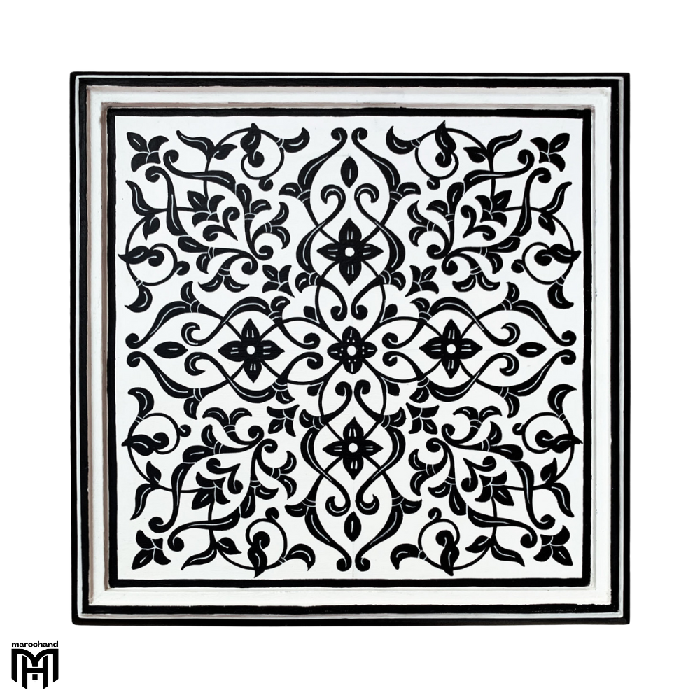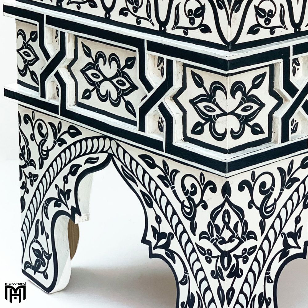 Introducing the Moroccan Oriental BAHTA Side Table in a sophisticated black and white color scheme, a striking piece from the BAHTA collection that merges traditional Moroccan artistry with contemporary monochrome elegance. This exceptional table features intricate hand-painted designs in bold black and white patterns, creating a dramatic visual statement that complements both modern and traditional interiors. The BAHTA table serves powerfully as a wood coffee table that adds graphic sophistication to your living space, or as a versatile side table that brings timeless contrast to your decor.